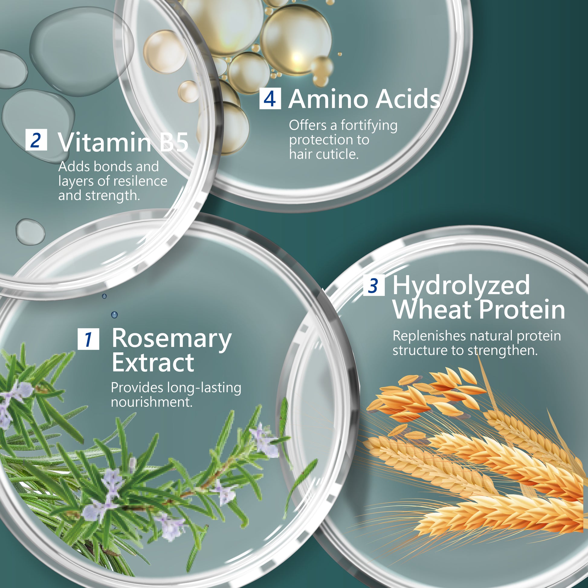 - Vitamins: Essential for hair health, a unique blend of key vitamins bond to the hair and adds structure for maximum resilience