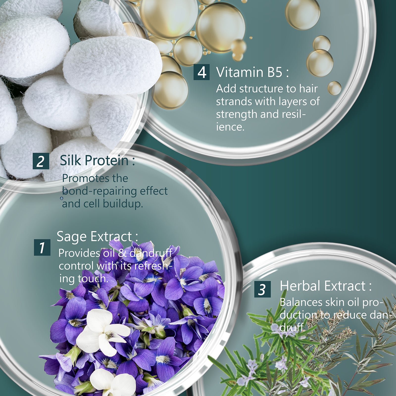 - Sage Extract: Strengthens & conditions hair